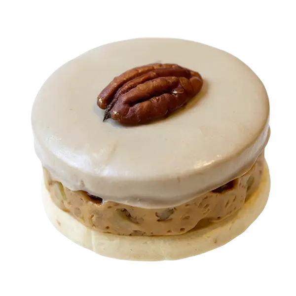 Toasted pecans in caramel folded with white chocolate and dulce de leche. Butter and milk caps, white chocolate crown, and a whole pecan on top. Pure temptation.